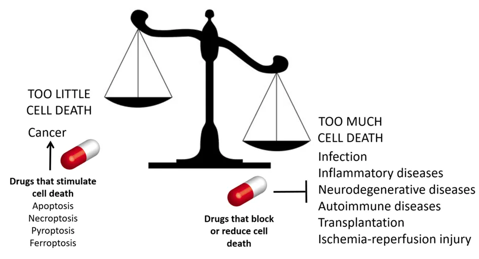 Cell death is essential for maintaining homeostasis. Under healthy, steady-state conditions, approximately 100 billion (10¹¹) cells die each day—equivalent to about one million cells per second. In pathological contexts, however, cell death becomes dysregulated: excessive cell death contributes to inflammatory and degenerative diseases, whereas insufficient cell death is a hallmark of cancer.