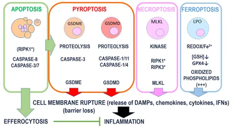 • Each cell death modality is associated with a specific membrane‑permeabilizing mechanism, including gasdermin cleavage in pyroptosis and secondary necrosis, MLKL activation in necroptosis, and lipid peroxidation–induced plasma membrane damage in ferroptosis.