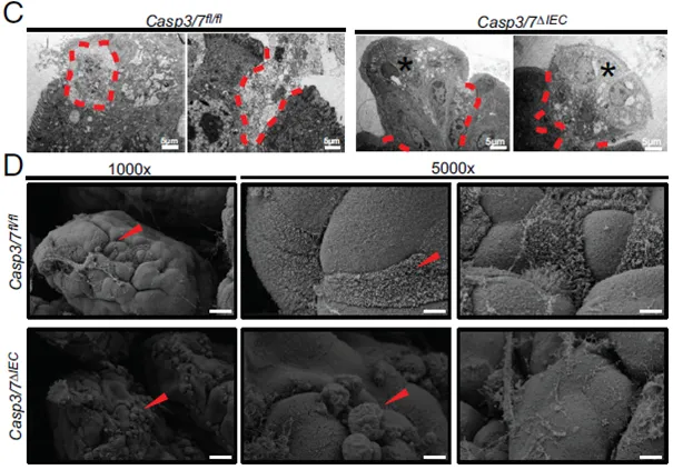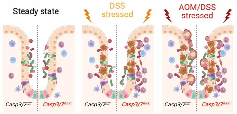 • Although apoptosis has long been considered essential for intestinal epithelial cell (IEC) turnover and immune homeostasis, IEC-specific deletion of caspase-3 and caspase-7 does not affect intestinal architecture, cellular composition, or proliferation.