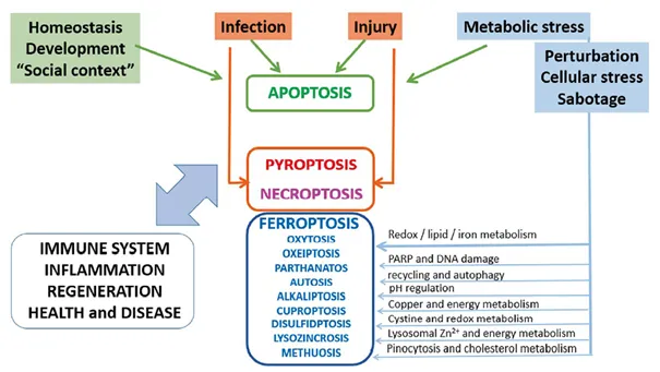 • Diverse cellular stresses, including infection and inflammation, trigger distinct forms of regulated cell death such as apoptosis, necroptosis, pyroptosis, and the metabolically driven process of ferroptosis, depending on the stimulus and cellular context.