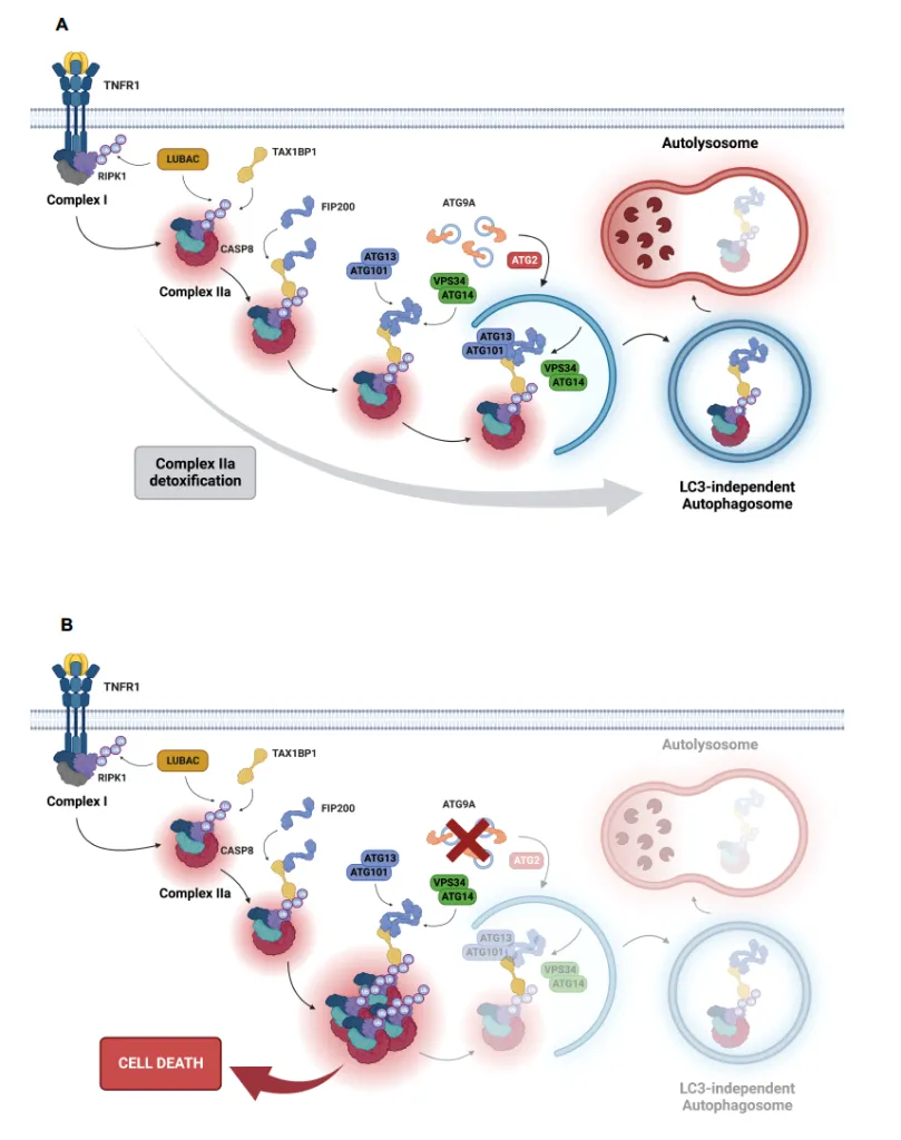 - The autophagy receptor TAX1BP1 recognizes M1-ubiquitinated RIPK1 within complex IIa and recruits FIP200 to initiate its encapsulation and degradation, bypassing the need for LC3